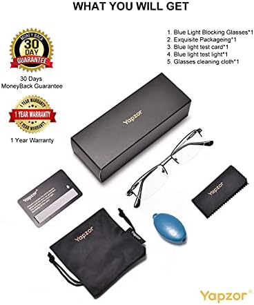 YAPZOR is at all times devoting to creating high quality merchandise with excessive efficiency. We provide blue mild blocking glasses for women and men with a number of colours to satisfy your personalised wants. Shopping for Blue mild blocking glasses/laptop glasses, you possibly can not solely obtain high quality merchandise , additionally nice buying expertise.Extended publicity to blue mild may cause eye pressure.SO,Simply put in your YAPZOR blue mild glasses that you’ll anti eye pressure and sensitivity to mild when going through laptop screens. Nice for workplace employees,play laptop video games,watching TV,utilizing cellphone/pad or any digigtal setting. YAPZOR blue mild blocking glasses/laptop recreation glasses anti blue mild enhance your sleep, provide help to sleep higher and have an excellent night time. Specs: Product Identify: YAPZOR Blue mild glasses/blue mild blocking glasses/laptop glasses/anti blue mild glasses/blue mild filter glasses