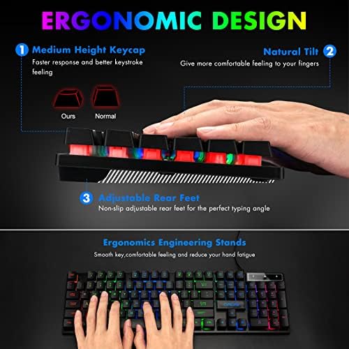 【RGB Backlit Gaming Keyboard】Backlight can swap amongst rainbow 7 coloration mild, breath mode and switch off.19 anti-ghosting keys, WIN key that may be disabled, 4 interchangeable “W/A/S/D” keys. Non-slip, splash-proof, imitate mechanical feeling keys and sense of rhythm, emitting character show clearly in darkish.