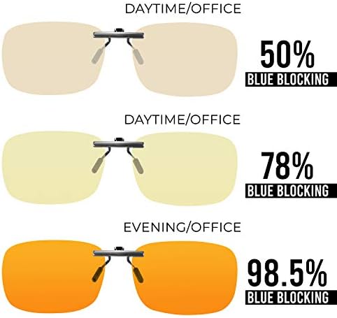 Clip-On Blue Mild Glasses. 3pk. Blocks 98.5%, 78%, 50% Blue Mild (420-460nm). Clear, Snug & Light-weight. Nice for Laptop computer, Desktop, Cellphone & Gaming. Assist in Sleep, Health, Enterprise & Well being.