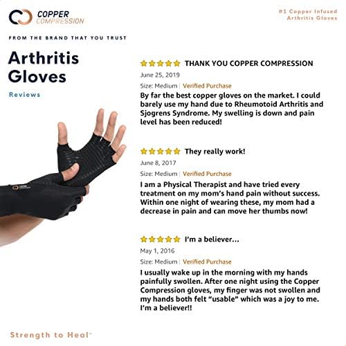 Highest Copper Content Compression Arthritis Gloves – Copper Compression Fingerless Arthritis Gloves are designed to help you get the support you need for all day and all night comfort. Commonly used by people suffering from pain in the hands, Arthritis, Carpal Tunnel, Tendonitis, stiff or sore muscles, tendons & joints, and more!