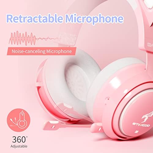 EASARS Gaming Headset, Cat Ear Headphones USB Headsets with Retractable Microphone Noise Cancelling, 7.1 Surround Sound Headset for PC, Pink