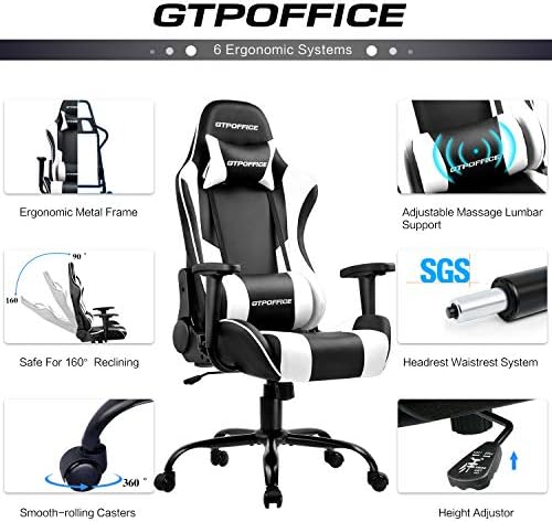 Gaming Chair Massage Office Computer Chair for Adult Reclining Adjustable Swivel Leather Computer Chair High Back Desk Chair Headrest and Massage Lumbar Support Cushion,1 Pack (White)