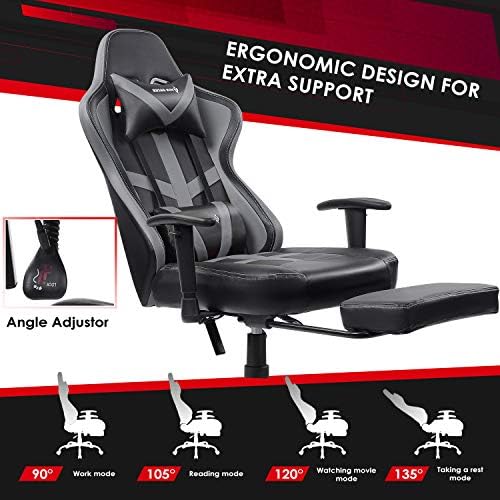 【Adjustable Reclining Gaming Chair】Get suitable position by adjusting the height and reclining the backrest of the gaming chair from 90° to 135°. The retractable padded footrest of the ergonomic gaming chair offers more positions.