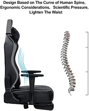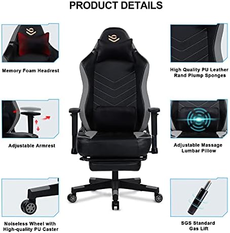 【MULTI-FUNCTION】-The ergonomic padded backrest and adjustable lower massage lumbar support cushion are designed to let you lean back in comfort and game in peace; Adjustable height, back angle and recline locking system to lock the back at any angle up to 155°; Adjustable Armrests; retractable padded footrest; 360-degree swivel.