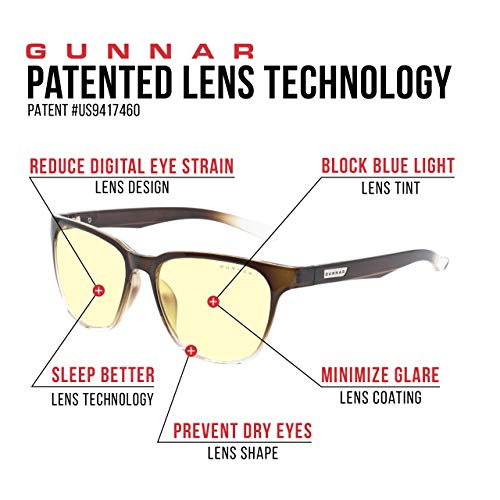 Recommended by doctors our blue light glasses & computer Glasses (patented lens #9417460) protects your vision, reduces eye strain, headaches and improve sleep quality while viewing tablets, computers, TV, and phones. Unlike other blue light blocking glasses, our blue light Protection Factor tells you exactly how much of the peak blue light spectrum (450nm) is blocked, to offer the best protection in the market. Available in clear & amber tint. Gunnar protects against symptoms stemming from prolonged screen-staring including migraines, headaches, dry eyes, blurry vision, negative effects of blue light exposure- cataracts and macular degeneration. The preferred blue light Glass for men and women. About berkeley: Specs (in mm) lens Width: 54, bridge: 16, Temple: 142. Gunnar produces ergonomically designed gaming/computer eyewear with a lightweight frame to give you a full day of comfortable screen viewing. Durable nylon frame material with a slight 0.2 magnification to give you the best viewing experience. Included with your purchase of our gaming and computer Glasses – microfiber pouch, microfiber cleaning cloth..
