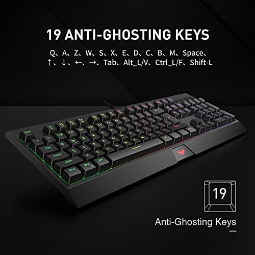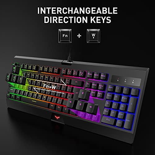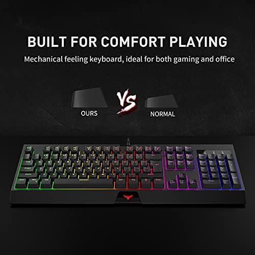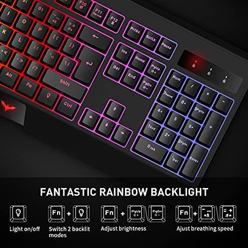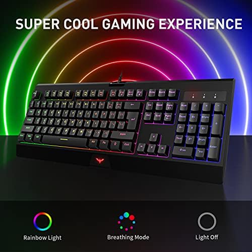 ★ Rainbow Backlit Gaming Keyboard: 104 Key wired keyboard is with 7 colors rainbow effect, and the backlight can switch between 7 color light rainbow mode, breathing mode and turn off. Fantastic backlit provides a cool gaming atmosphere.
