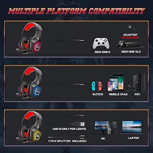This gaming headset is compatible with PS4, Xbox One (older ones requires an adapter), PC, laptop, Switch (audio), New 3DS LL/3DS (audio), 3DS LL/3DS (audio), PSP (audio), tablet, mobile phone, etc. USB is for RGB light only.