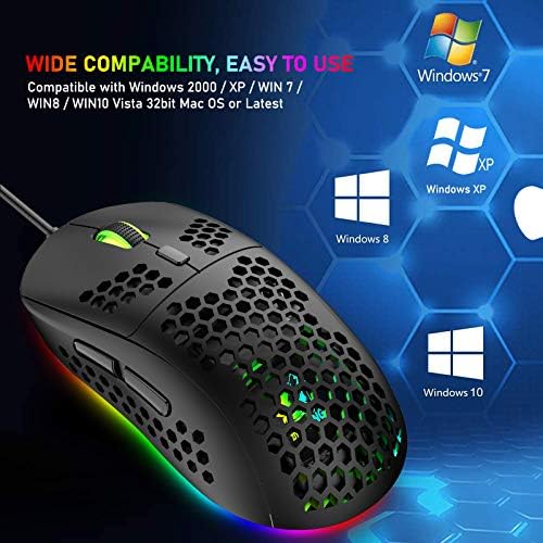 1.This wired gaming mouse undertake light-weight perforated ergonomic honeycomb housing, scale back weight, guarantee lengthy utilizing with out fatigue.2.Undertake totally different RGB backlight impact, this honeycomb mouse can supply attractive backlight when utilizing in darkish place, extra cool and attention-grabbing.3.This gaming mouse is supplied with lengthy paracord USB cable, no cable pull when shifting, extra versatile and sturdy.