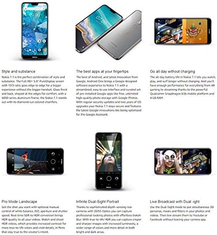 Coloration: Metal Uncover the facility of the Nokia 7. 1 a contemporary and punctiliously crafted cellphone that includes the most recent era Qualcomm Snapdragon 636 cell platform that may allow you to re-imagine what will be finished on a smartphone. The Nokia 7. 1 has been constructed with the person in thoughts at each step of the method. We began with a vivid, excessive distinction 2. 5D 5. 84 full HD+ display that create sensible saturated colours making your photographs, movies, and apps look higher than ever. The 2220×1080 decision and HDR help saturates your display and makes the whole lot from textual content to icons sharper and cleaner. The all new 19: 9 facet ratio and a compact display to physique ratio implies that 95% of your cellphone is extra display and fewer borders all protected by Corning Gorilla glass. The Nokia 7. 1 is made much more highly effective by benefiting from the efficiencies of Android One. With Android One from Google you might have: probably the most superior Android with no bloatware or complicated re-skins, month-to-month safety updates, and begin with Android 8. 0 Oreo (quickly Pie). The 4GB of RAM and 64GB storage of inner storage ensures that the whole lot works simply the way in which you need and if you end up needing extra space, the Nokia 7. 1 storage is up expandable as much as 400GB with a micro SD card. All that storage is put to make use of with the twin 12+5MP rear digital camera that creates vibrant and beautiful pictures using HDR+ expertise for photographs and an 8MP selfie digital camera with an 84 diploma FOV so everybody matches within the image each time. The Nokia 7. 1 is made full with all the most recent connection choices together with NFC, Bluetooth 5. 0, OTG, a fingerprint sensor, USB Sort-C quick charging that takes your cellphone to 50% cost in lower than half-hour so that you by no means must cease for lengthy. Rise up and inform your story with the Nokia 7. 1, a cellphone constructed for you.Battery sort : Built-in 3060 mAh battery