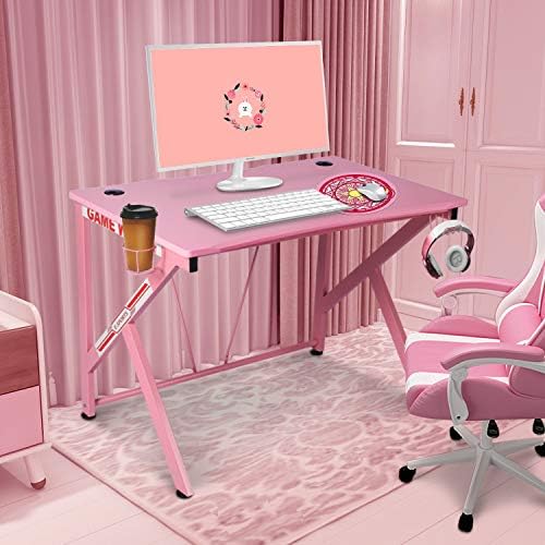 Okay-Formed Gaming Desk Pink 42 Inch Workstation with Shelf for Plug Board,Headphone Hook,2 Wire Take-up Gap and Cup Holder Gaming Desk Workstation