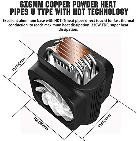 【6 Heat Pipes Direct Touch and Super Heat Dissipation·230W TDP】6 pcs 6mm nickel plating copper powder heat pipes U type for fast thermal conduction, 55X35mm aluminum base with HDT (Heat pipes Direct Touch). The heat pipe is in direct contact with the CPU to achieve efficient and rapid heat transfer for maximum heat dissipation. TDP is up to 230W, greatly improved heat dissipation performance.