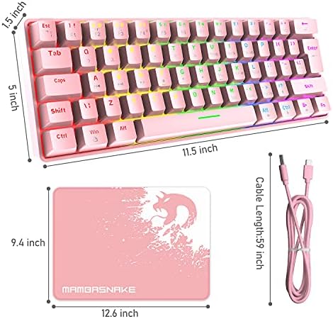 Pink 60% True Mechanical Gaming Keyboard 20 RGB Chroma Backlit Glowing Characters Kind C Wired 62 Keys Sport Keyboard Waterproof Full Anti-ghosting and Gaming Mouse Pad for Players and Typists