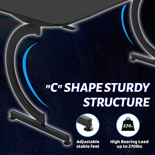 【Stable & Adjustable】Thick metal frame provides more support, hence ensure stability and durability. Desktop of this gaming desk is made of a unique composite material. The adjustable leg pads keep the table stable even on uneven floor.