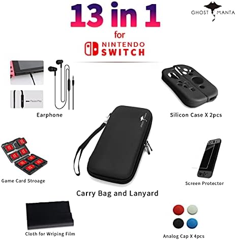 Ghost Manta $69 Value 13 in 1 SUPER KIT: Card for scraping film, LCD FILM, Earphone, Analog cap x4, Silicon case x 2pcs, Cloth for wiping film, card case, Carry bag. Make Your Switch More Stable and Convenient When You’re Traveling or Not Using.