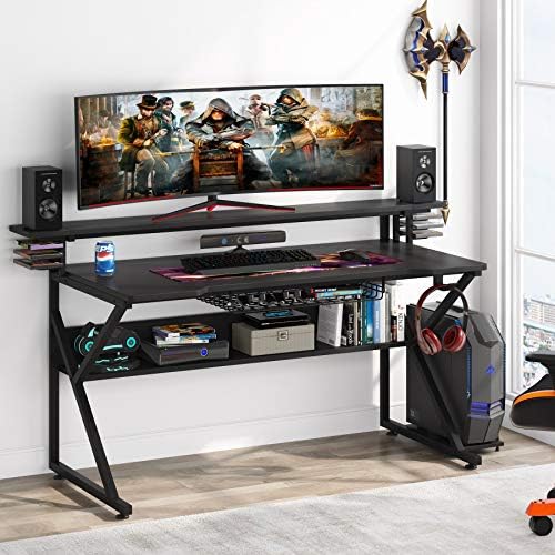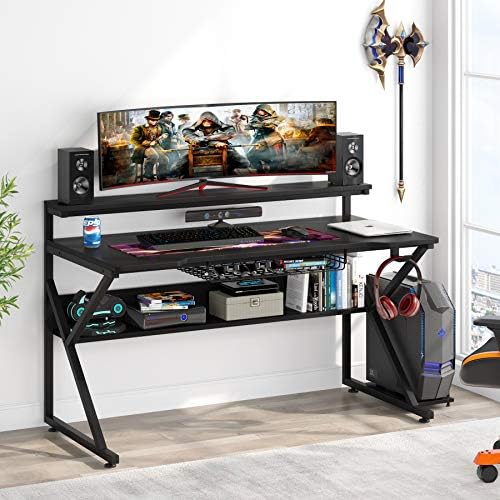 Tribesigns Gaming Desk with Storage Shelf and Screens Shelf, 47 inches PC Pc Desk, House Workplace Desk Gamer Workstation with CPU Stand and Headphone Hook/CD Holder, Black