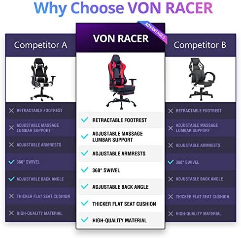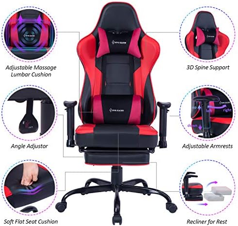 VON RACER Therapeutic massage Gaming Chair Racing Workplace Chair – Adjustable Therapeutic massage Lumbar Cushion, Retractable Footrest and Arms Excessive Again Ergonomic Leather-based Pc Desk Chair, Crimson/Black